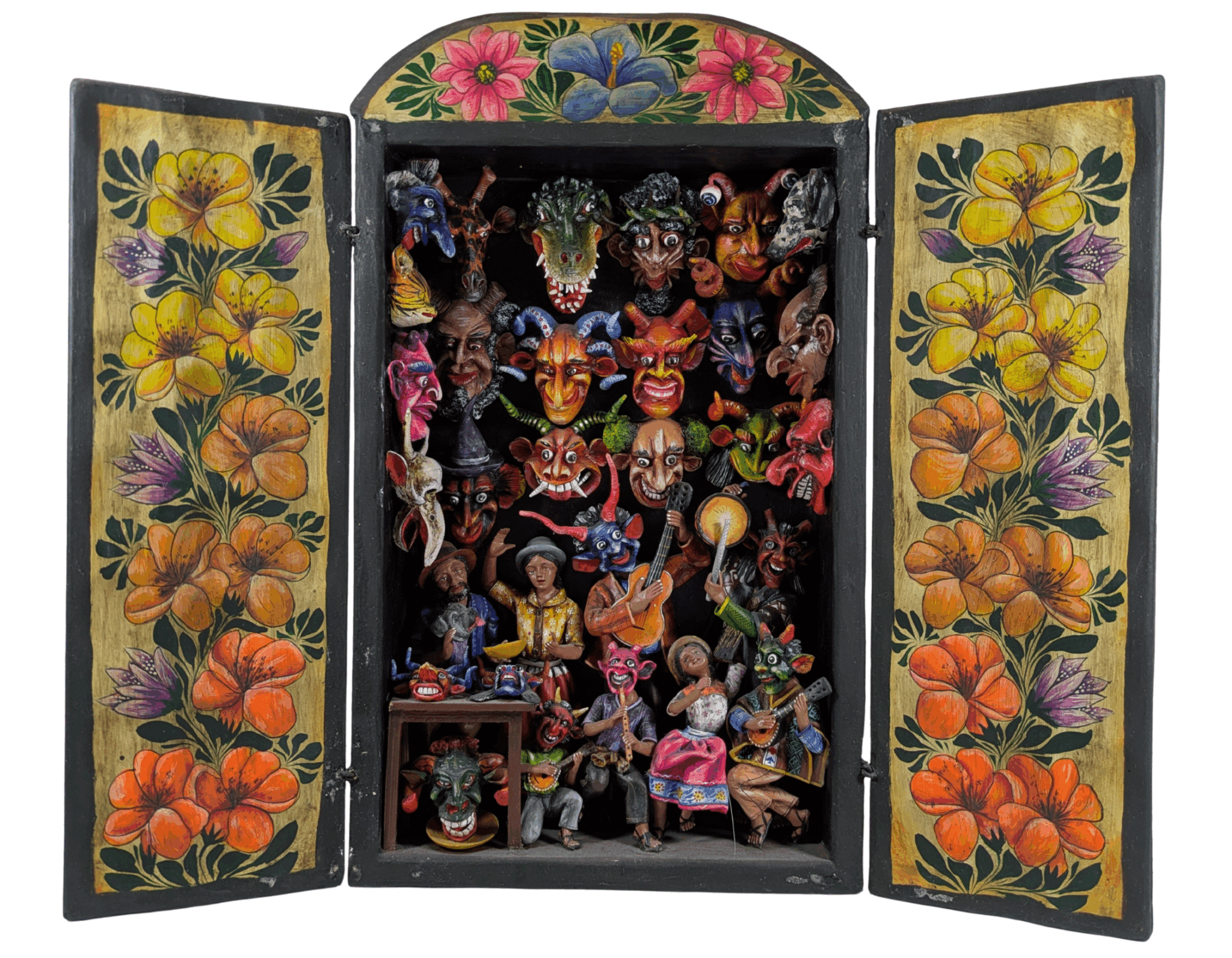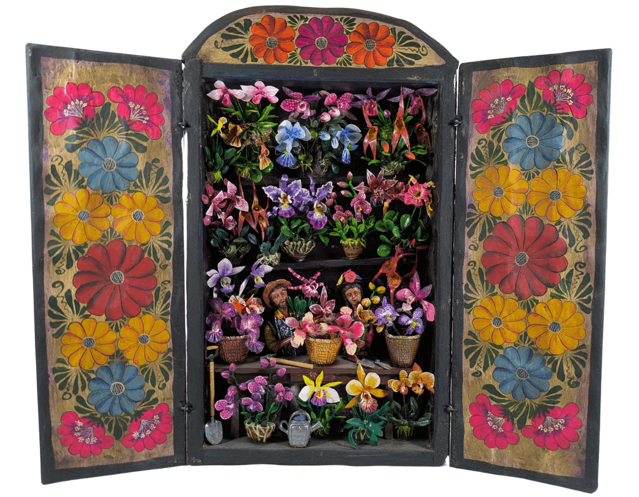 The creation of retablos in Peru can be traced back to the Spanish conquerors, who brought portable wooden altars containing figures of Catholic saints. Peruvian retablos remained firmly imbedded with religious iconography for centuries, but in the 1940s, a movement developed among Peru’s folk artists to begin including Peruvian culture, centering the struggles and joy of their people. Claudio’s world-renowned retablos are at the forefront of this living movement, and his dedication to his artistry and cultural activism have led to his works being acquired by numerous institutions around the world, including the Smithsonian and the Museum of Man.